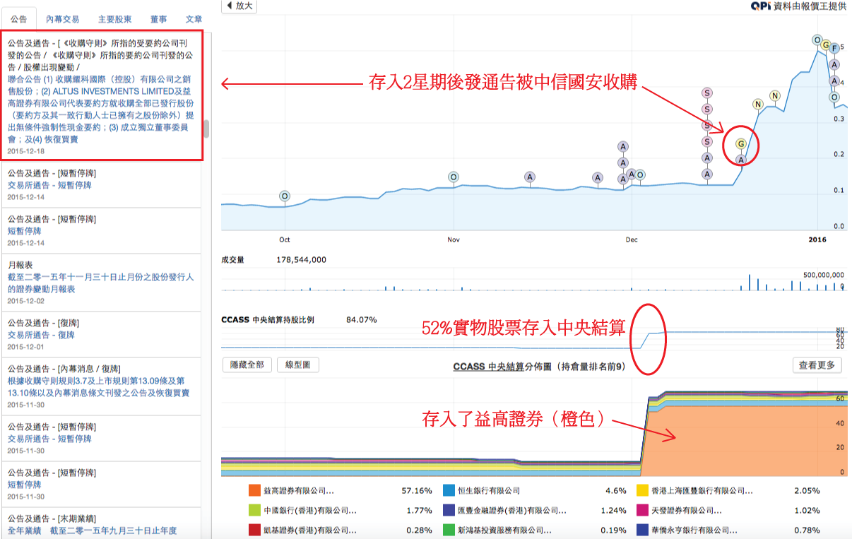 從 T系統的個股分析圖 (下圖) 中所見,於2015年12月3日突然有52%的實物股票存入了益高證券。這時的股價並沒有什麼異樣。於大約兩星期後的12月18日耀科國際發出要約通告,正式公佈被中信國安集團收購。這消息刺激股價於公佈被收購後2星期內升了3倍有多!於12月3日的實物存入應該是為這次的易手鋪路。設定了 CCASS 持股變動提示的用戶可捕捉到這次的 CCASS 異動,買入了的話可謂獲利甚豐!