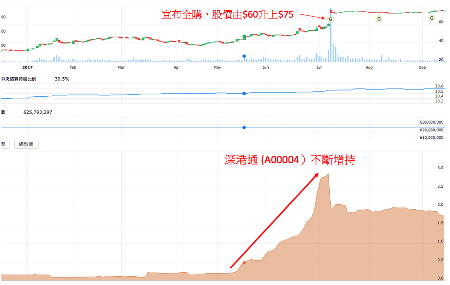 董建華家族旗下的東方海外(316)於2017年7月8日宣布以接近4成的溢價賣盤,刺激股價急升。其實賣盤消息早於2018年1月已於多份媒體流傳,但董先生多次於公開場合否認。但透過 DT 系統的個股分析圖可發現 CCASS 於5月初開始有大量內地投資者透過深港通買入東方海外股票,深港通 (A00004) 的 CCASS 持股量由5月10日的0.2%急增至宣布賣盤前7月6日的2.9% (見下圖)。當中有否涉及春江鴨掌握內幕資訊大手買貨就真的不得而知啦,但透過 CCASS 追蹤深港通 (A0003) 及滬港通 (A00004) 的持股異動可能會發掘到一些意想不到的投資機會!