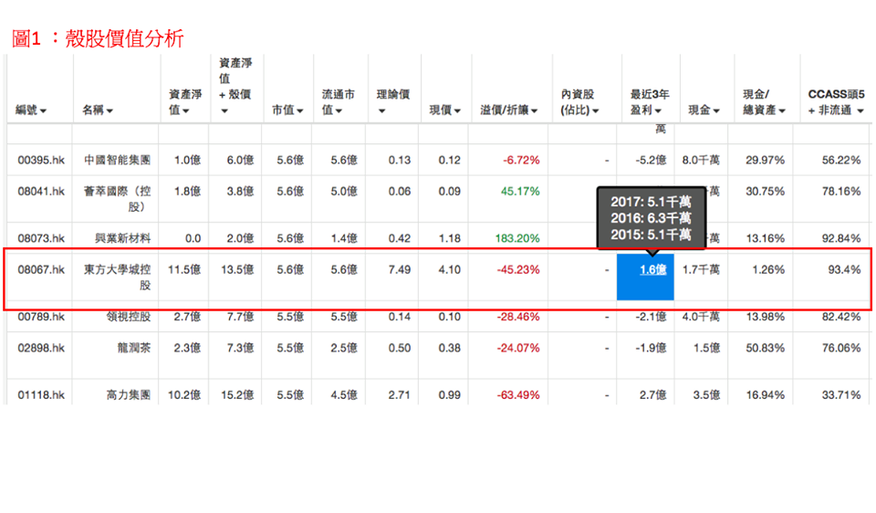 8067 東方大學城是一隻非常不錯的股票。大於10億的 NAV (淨資產值) 但只有3億多的市值,過去3年盈利一直符合轉主板要求,股權集中等等 (圖1:殼股價值分析功能),大有機會轉主板借勢炒上。東方大學城於2018年1月5日收市後發通告宣布正式申請轉主板,股價受利好消息帶動下單日升了 32%!