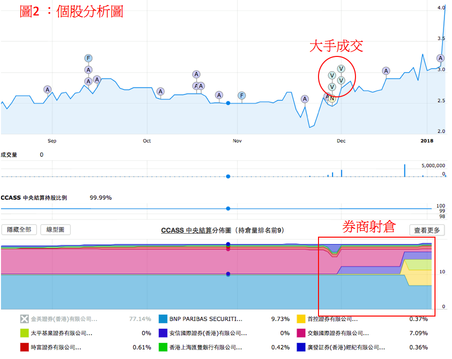要捕捉到這樣的機會除了掌握以上資訊外,CCASS 異動也有莫大啟示。利用 DT 系統的個股分析圖翻查東方大學城的 CCASS 資料,發現它於2017年11月尾開始頻頻射倉,當中牽涉5家券商及接近10%的股票轉移,不少射倉也是以透過場內單宗大手成交做的 (圖2綠點)。無獨有偶,於射倉後不久便宣布轉主板了。