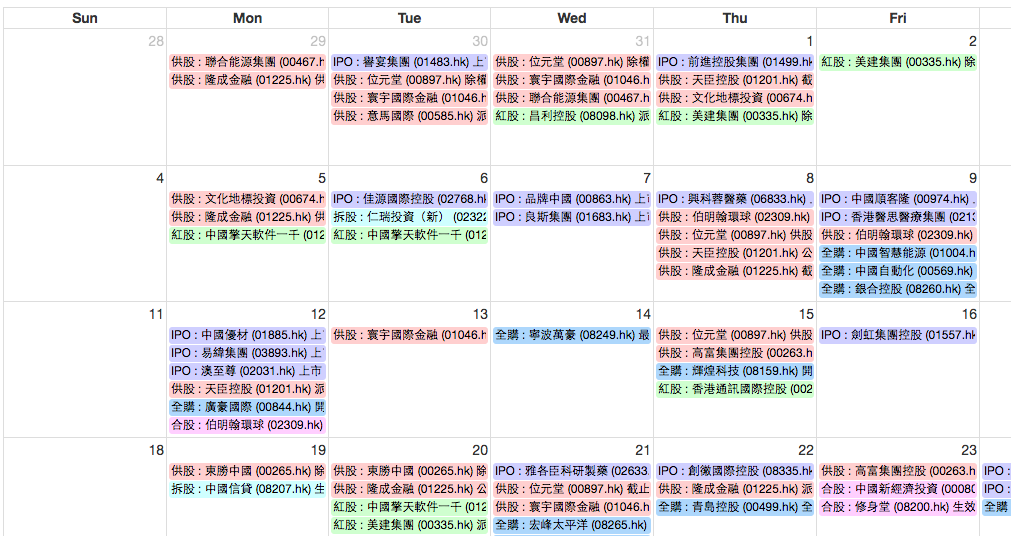 系統也提供財技事件日曆功能,匯集各類財技重要日子以日曆形式呈現 (如供股最後付款日,全購最後接納日,上市一年等),使用戶更有效掌握每日新鮮發生的重要財技事件。
