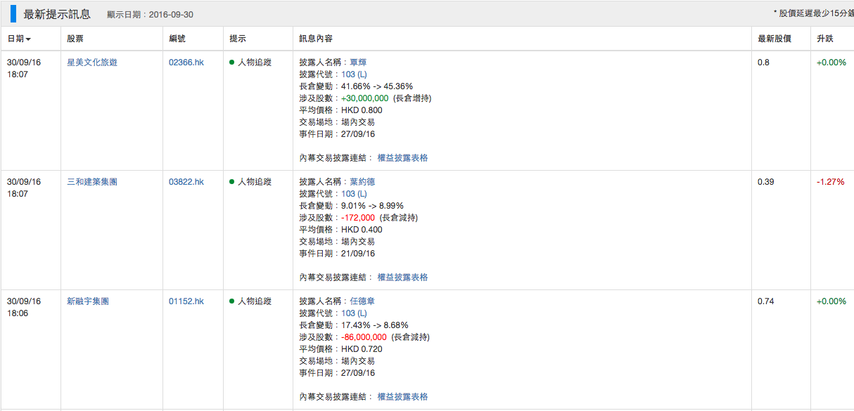 DT系統追蹤超過30,000個人物/法團的交易,每當你選定的股票或設定的追蹤人物/法團有買賣動作的話,系統會第一時間發電郵或推送通知。你不會再漏掉任何最新內幕人交易消息。