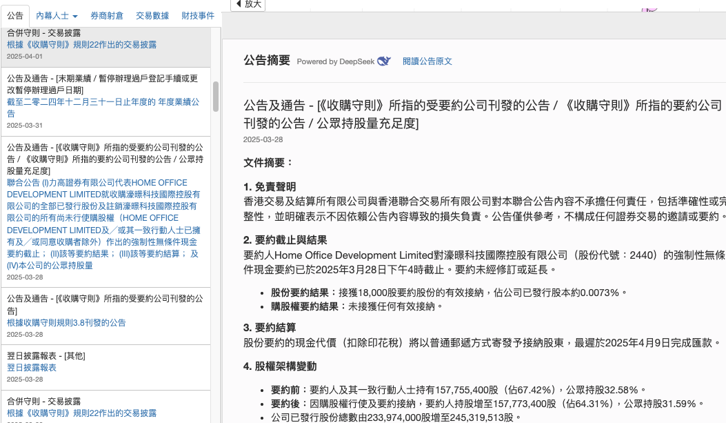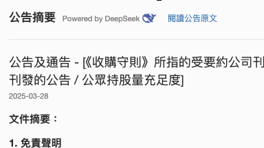 系統利用最新 DeepSeek 大型語言模型自動生成上市公司公告摘要。公告摘要包含了公告內容的各項重點及相關數據,讓用戶不需閱讀公告原文的情況下輕鬆及快速掌握公告的重點內容及數字。