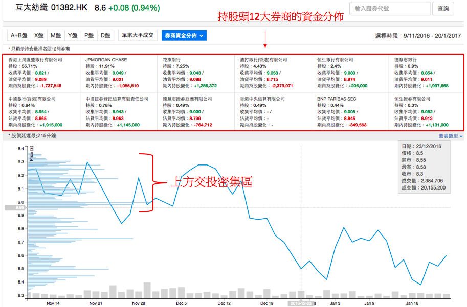系統的券商資金分佈功能於成交分佈圖上列出 CCASS 持倉最多的頭12間券商的買賣價位分佈。透過分析各券商的買賣價位,用戶可推斷於某成交密集區究竟是大戶或散戶買(沽)貨。