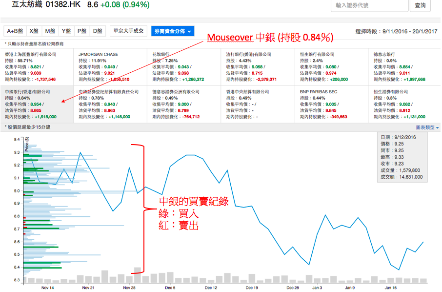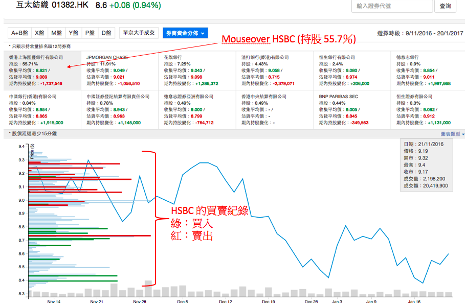 從以上幾幅圖所見,1382 (互太紡織) 的股價在交投密集區橫行期間持股最大的券商 (HSBC,持股55.7%) 不斷大手沽貨 (紅棒),而一些散戶行如花旗,渣打,中銀等等接了貨 (綠棒)。有理由推斷是大股東一幫人沽出手上的股票給散戶。因此股價下行的風險非常高。不出所料,股價跌穿了上方交投密集區後便拾級而下。