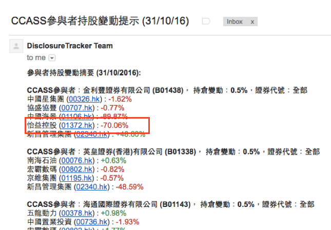 以怡益控股為例,設定了 CCASS 持股變動提示的用戶會收到以下電郵。可輕鬆捕捉到上述的射倉異動。
