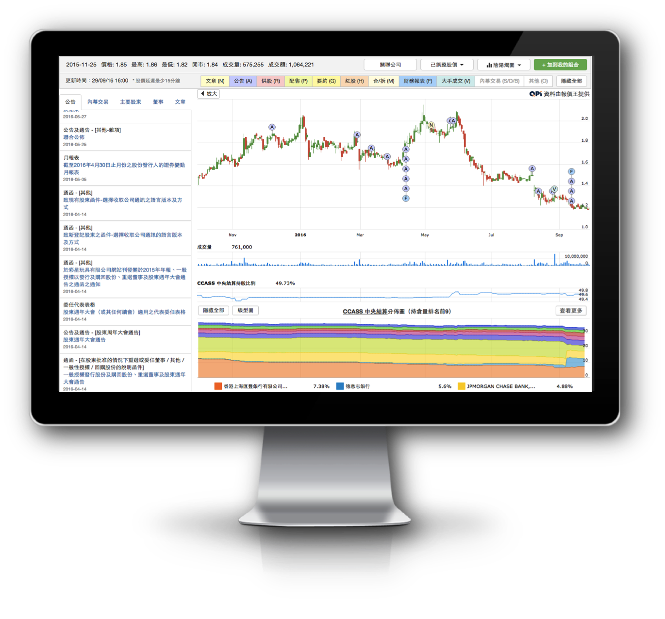 此外,為使用戶能更高效地進行數據分析,系統提供 CCASS 數據圖像化功能,把中央結算參與者每個交易日的持倉量以時間序列呈現出來,使各種 CCASS 異動(如轉倉、提倉等)一目了然。
