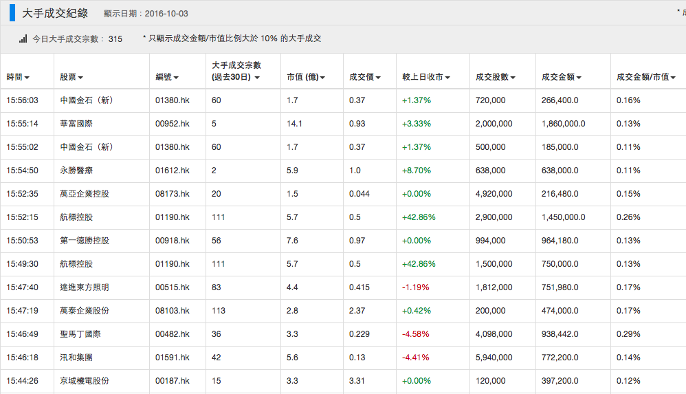 一些突然發生的單宗大成交,佔了單日成交額7成或以上的,往往是幕後人士過貨炒作前的先兆。以往捕捉這類場內過貨的主要方法是透過睇中央結算 CCASS 的倉位變化,但 CCASS 有著 T+2 的時差。為使用戶及早捕捉這些大戶射倉交易,系統透過素描即市發生的每一單成交,列出上述所有大手成交,更配合圖表供大家參考,讓用戶可即市 T+0 即市監察大戶過貨。