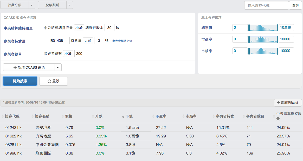 系統更設有中央結算數據篩選器,使用戶能針對 CCASS 的數據(如股權集中度,轉倉異動等)自訂條件進行選股。