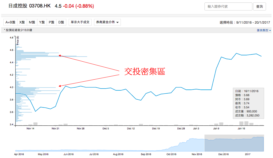 圖中可見3708 (日成控股) 有兩個交投密集區。一般來說,交投密集區會被解讀為“支持/阻力”位。如圖中所示,股價於兩個交投密集的區間上落。上方的交投密集區可理解為俗稱的“蟹貨區”,意指於投資者買入股票後,股價於一段時間內都維持在買入價格以下,若用現價沽出就會蝕錢,所以蟹貨的蟹字就是指投資者好像大閘蟹般被縛住。至於下方的交投密集區可理解為“支持位”,股價一旦跌至該價位便有一班投資者覺得價格吸引而大舉買入。