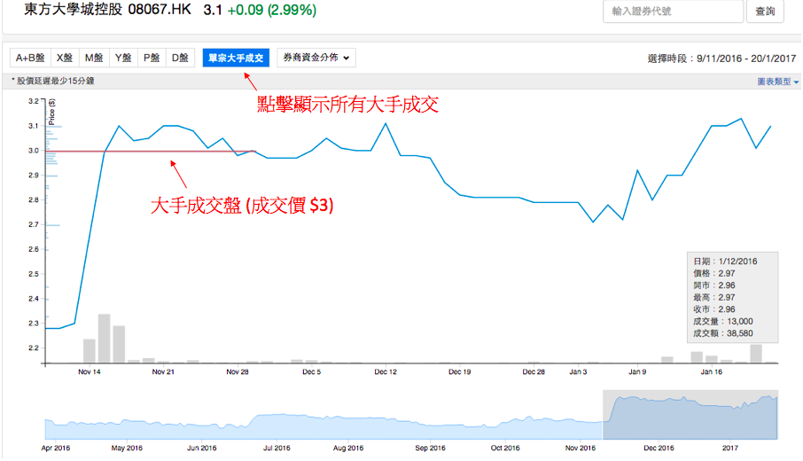 圖中所見大手成交 (紅線) 的價格為 $3,有幕後人士於該價位接了貨。我們可以視該價位為一個強力的支持位般看待。股價一旦跌穿該支持位連幕後人士也輸錢了,我們也應該考慮沽貨離場。