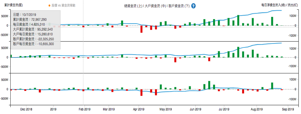 另外,用戶也需留意大戶 (中圖) 與散戶 (下圖) 的藍線走勢對比,有沒有出現背馳。例如,大戶資金持續流入,散戶資金持續流出,而股價橫行,則可能代表股價正處於潛伏階段,待大戶買夠貨後便會炒上。